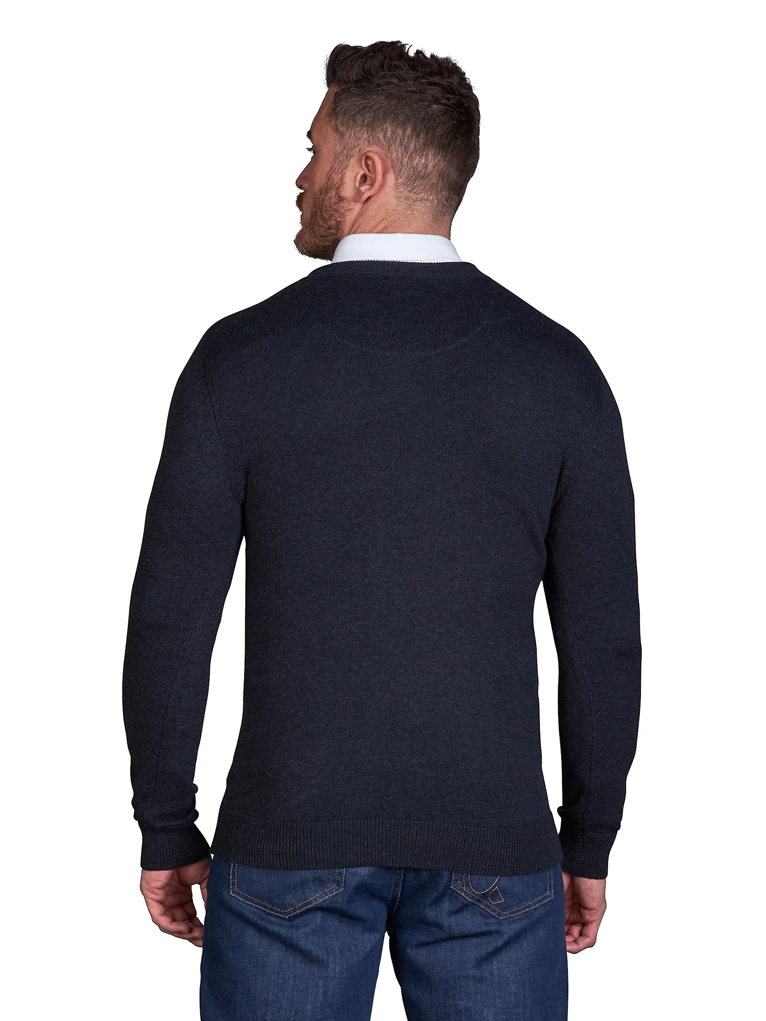 This classic men's v neck jumper is made from a premium soft, high-quality cotton cashmere blend, making it both stylish and hardwearing. With a classic fit, long cuffed sleeves, and a contrast-coloured embroidered logo on the chest, this jumper is the perfect companion for a shirt and is ideal for day-to-day style, from casual to smart. Perfect for layering, it offers longevity and comfort. Black plain basic v-neck knitted jumper in sizes small to big and tall - up to 6XL.